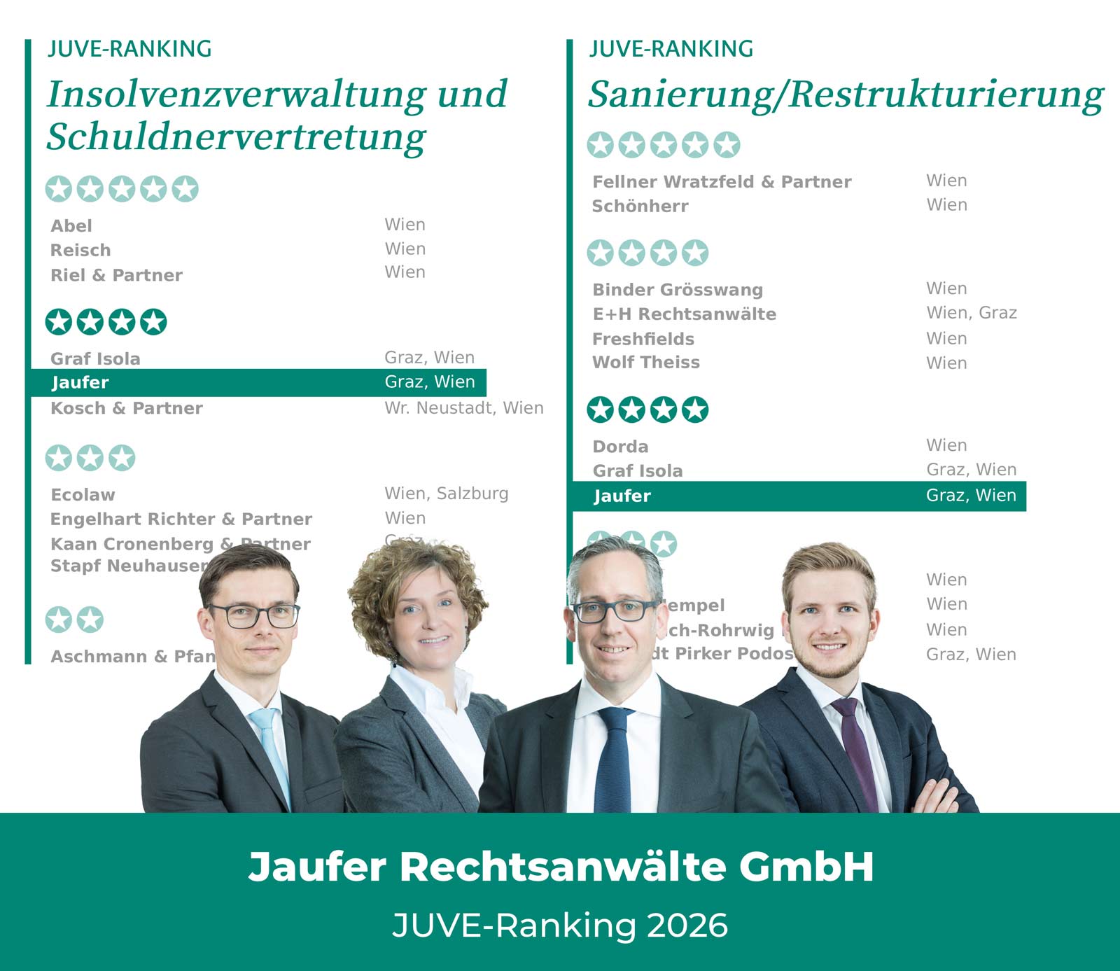 Das Ranking bestätigt die breite Kompetenz und Erfahrung sowohl in der außergerichtlichen wie in der gerichtlichen Beratung rund um Unternehmen in der Krise – sowohl in der Vertretung von in- und ausländischen Banken sowie von Unternehmensgruppen (Konzernen). Dafür wurde mit 4 Sternen ein Spitzenplatz vergeben. Außerdem gab es 4 Sterne für die Tätigkeit als Insolvenzverwalter, worüber sich unsere 4 Kanzleipartner:innen, Clemens Jaufer, Mario Leistentritt, Franziska Jaufer und Alexander Painsi sehr freuen und in ihrem Weg bestätigt sehen.